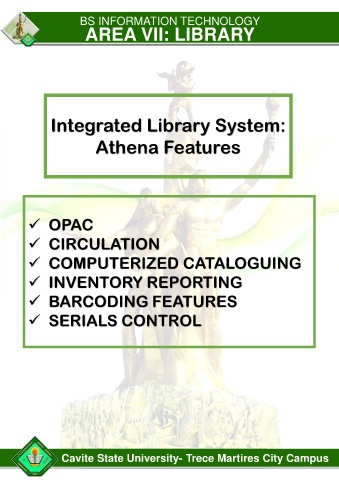 BS INFORMATION TECHNOLOGY AREA VII: LIBRARY Integrated Library System: Athena Features ✓ OPAC ✓ CIRCULATION ✓ COMPUTERIZED CATALOGUING ✓ INVENTORY REPORTING ✓ BARCODING FEATURES ✓ SERIALS CONTROL Cavite State University- Trece Martires City Campus