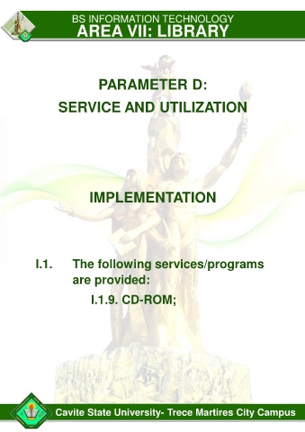 BS INFORMATION TECHNOLOGY AREA VII: LIBRARY PARAMETER D: SERVICE AND UTILIZATION IMPLEMENTATION I.1. The following services/programs are provided: I.1.9. CD-ROM; Cavite State University- Trece Martires City Campus