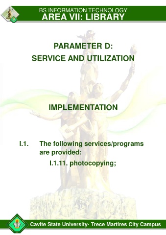 BS INFORMATION TECHNOLOGY AREA VII: LIBRARY PARAMETER D: SERVICE AND UTILIZATION IMPLEMENTATION I.1. The following services/programs are provided: I.1.11. photocopying; Cavite State University- Trece Martires City Campus