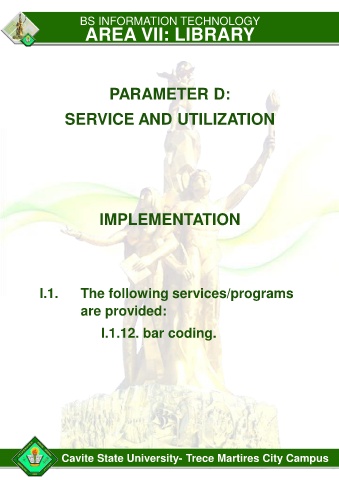 BS INFORMATION TECHNOLOGY AREA VII: LIBRARY PARAMETER D: SERVICE AND UTILIZATION IMPLEMENTATION I.1. The following services/programs are provided: I.1.12. bar coding. Cavite State University- Trece Martires City Campus