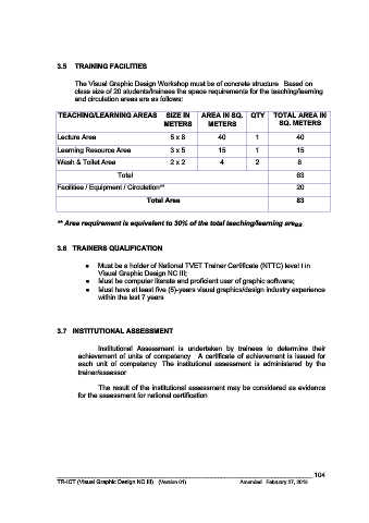class size of 20 students/trainees the space requirements for the teaching/learning