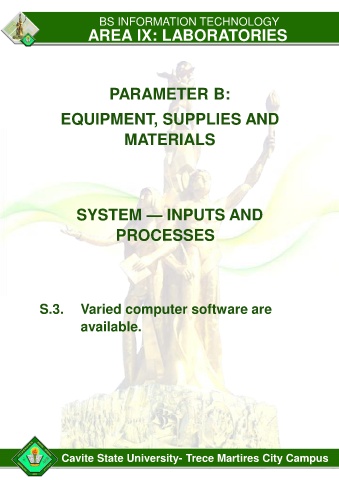 BS INFORMATION TECHNOLOGY AREA IX: LABORATORIES PARAMETER B: EQUIPMENT, SUPPLIES AND MATERIALS SYSTEM — INPUTS AND PROCESSES S.3. Varied computer software are available. Cavite State University- Trece Martires City Campus