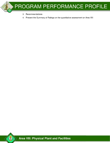 PROGRAM PERFORMANCE PROFILE 3. Recommendations 4. Present the Summary of Ratings on the quantitative assessment on Area VIII Area VIII: Physical Plant and Facilities