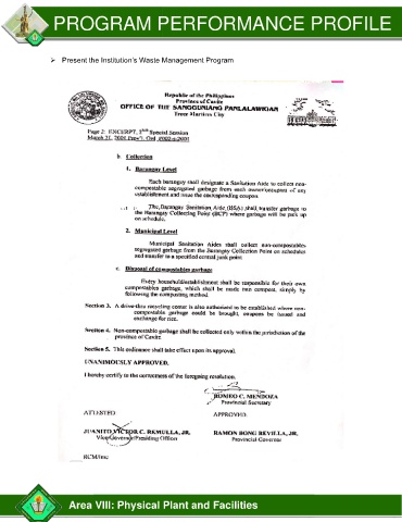 PROGRAM PERFORMANCE PROFILE ➢ Present the Institution’s Waste Management Program Area VIII: Physical Plant and Facilities