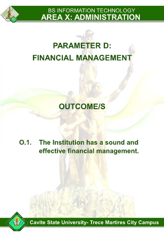 BS INFORMATION TECHNOLOGY AREA X: ADMINISTRATION PARAMETER D: FINANCIAL MANAGEMENT OUTCOME/S O.1. The Institution has a sound and effective financial management. Cavite State University- Trece Martires City Campus