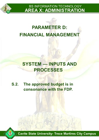 BS INFORMATION TECHNOLOGY AREA X: ADMINISTRATION PARAMETER D: FINANCIAL MANAGEMENT SYSTEM — INPUTS AND PROCESSES S.2. The approved budget is in consonance with the FDP. Cavite State University- Trece Martires City Campus