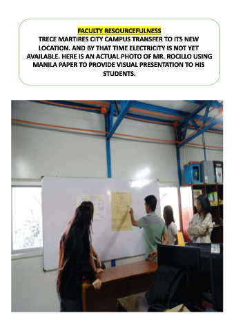FACULTY RESOURCEFULNESS TRECE MARTIRES CITY CAMPUS TRANSFER TO ITS NEW LOCATION. AND BY THAT TIME ELECTRICITY IS NOT YET AVAILABLE. HERE IS AN ACTUAL PHOTO OF MR. ROCILLO USING MANILA PAPER TO PROVIDE VISUAL PRESENTATION TO HIS STUDENTS.