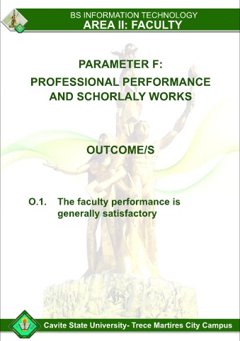 BS INFORMATION TECHNOLOGY AREA II: FACULTY PARAMETER F: PROFESSIONAL PERFORMANCE AND SCHORLALY WORKS OUTCOME/S O.1. The faculty performance is generally satisfactory Cavite State University- Trece Martires City Campus