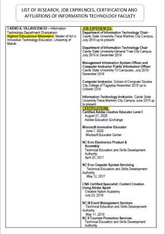 LIST OF RESEARCH, JOB EXPIRENCES, CERTIFICATION AND AFFLIATIONS OF INFORMATION TECHNOLOGY FACULTY