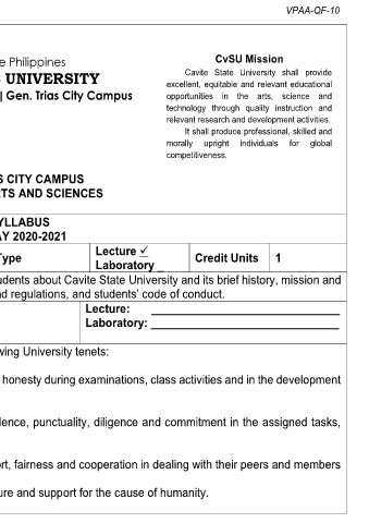 Republic of the Philippines CAVITE STATE UNIVERSITY Tanza ǀ Trece Martires City ǀ Gen. Trias City Campus TRECE MARTIRES CITY CAMPUS DEPARTMENT OF ARTS AND SCIENCES COURSE SYLLABUS 1 st Semester, AY 2020-2021 Institutional Type Orientation This course will focus on delivering orientation to the students about Cavite State University and its brief history, mission and vision, tenets and principles, general academic rules and regula