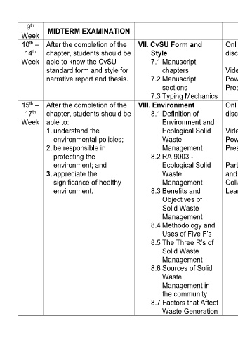 VII. CvSU Form and 1 st week 20-item quiz CvSU Form Distanc Online lecture of and Style e Mode discussion Style January Manual 7.1 Manuscript Video and chapters Powerpoint 7.2 Manuscript Presentation sections 7.3 Typing Mechanics 3 rd week Class/Group Philippine Distanc Online lecture VIII. Environment of Project: Environmen e Mode discussion 8.1 Definition of January Conceptualize a tal Policies
