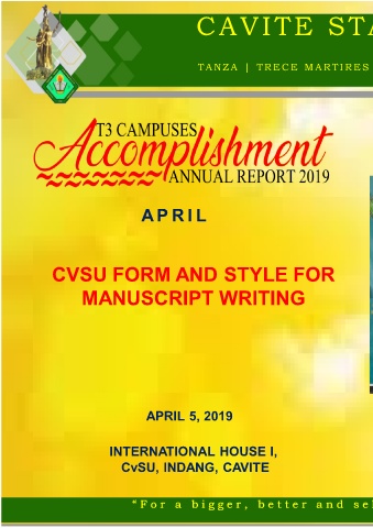 T Y T I S R E V I N U E T A TR I A S C I TY C A M P U S E S C I TY | G E NE R A L S M A R TI R E S E T I | TR E CE V A TA NZ A C L I CVSU FORM AND STYLE FOR MANUSCRIPT WRITING APRIL 5, 2019 INTERNATIONAL HOUSE I, CvSU, INDANG, CAVITE R P A