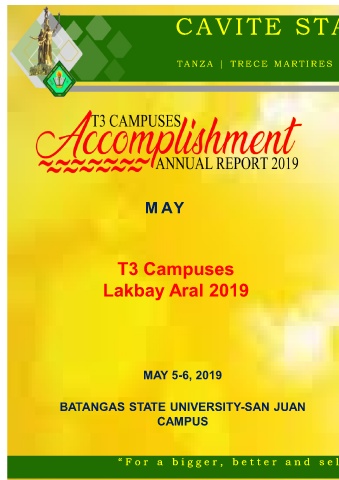 A Y T I S R E V I N U E T C I TY C A M P U S E S TR I A S G E N E R A L C I TY | T S M A R TI R E S E T TR E C E I V | A TA N Z A C T3 Campuses Lakbay Aral 2019 MAY 5-6, 2019 BATANGAS STATE UNIVERSITY-SAN JUAN CAMPUS AY M