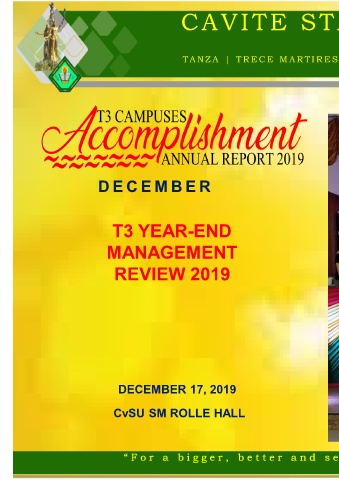T Y T I S R E V I N U E T A C I TY C A M P U S E S TR I A S G E N E R A L C I TY | S M A R TI R E S E T TR E C E I V | A TA N Z A R C E B T3 YEAR-END MANAGEMENT REVIEW 2019 DECEMBER 17, 2019 CvSU SM ROLLE HALL M E C E D