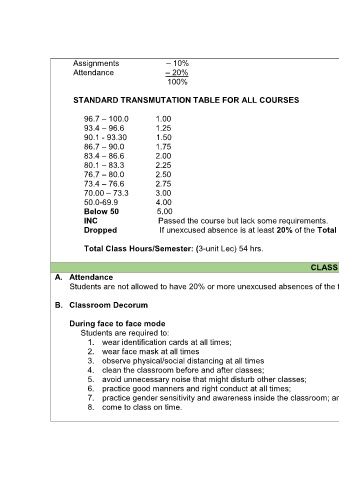 Students are not allowed to have 20% or more unexcused absences of the total face to face class hours; otherwise, they will be graded as “DROPPED”.