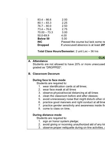 Students are not allowed to have 20% or more unexcused absences of the total face to face class hours; otherwise, they will be