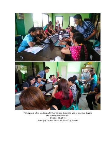 Participants while working with their sample business name, logo and tagline (Advertisement Materials) October 13. 2018 Barangay Osorio, Trece Martires City, Cavite