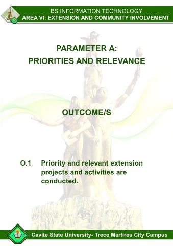 BS INFORMATION TECHNOLOGY AREA VI: EXTENSION AND COMMUNITY INVOLVEMENT PARAMETER A: PRIORITIES AND RELEVANCE OUTCOME/S O.1 Priority and relevant extension projects and activities are conducted. Cavite State University- Trece Martires City Campus