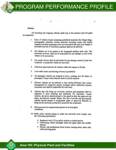 PROGRAM PERFORMANCE PROFILE Area VIII: Physical Plant and Facilities