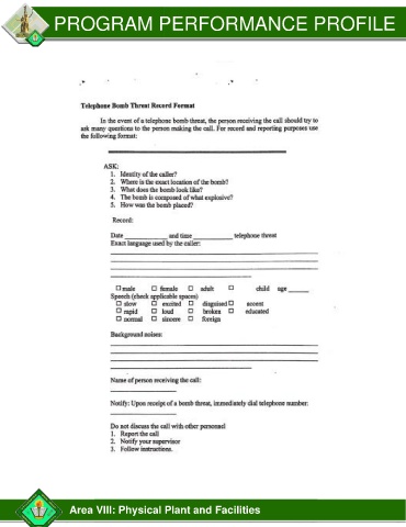 PROGRAM PERFORMANCE PROFILE Area VIII: Physical Plant and Facilities