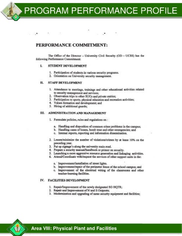 PROGRAM PERFORMANCE PROFILE Area VIII: Physical Plant and Facilities
