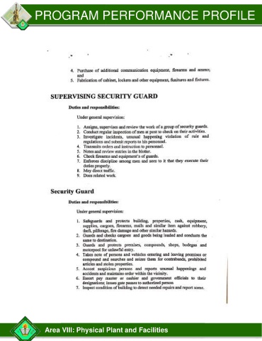 PROGRAM PERFORMANCE PROFILE Area VIII: Physical Plant and Facilities