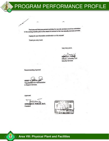 PROGRAM PERFORMANCE PROFILE Area VIII: Physical Plant and Facilities