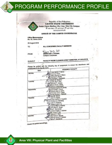 PROGRAM PERFORMANCE PROFILE Area VIII: Physical Plant and Facilities
