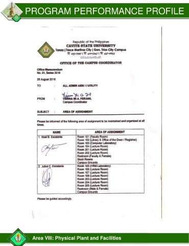 PROGRAM PERFORMANCE PROFILE Area VIII: Physical Plant and Facilities