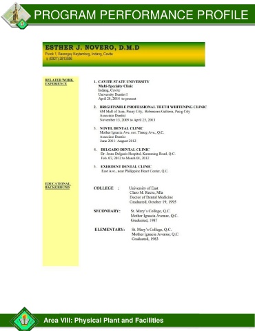 PROGRAM PERFORMANCE PROFILE Area VIII: Physical Plant and Facilities