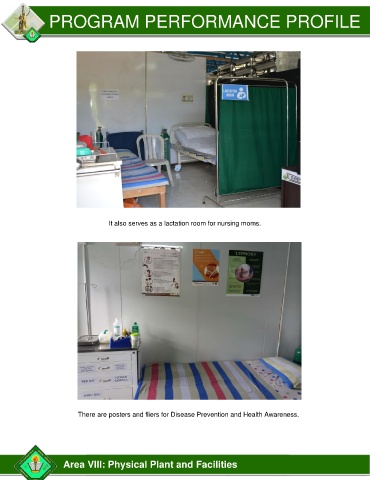 PROGRAM PERFORMANCE PROFILE It also serves as a lactation room for nursing moms. There are posters and fliers for Disease Prevention and Health Awareness. Area VIII: Physical Plant and Facilities