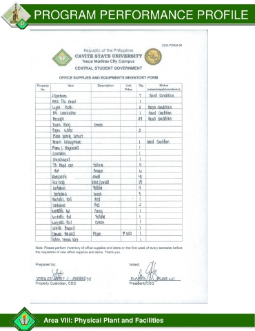PROGRAM PERFORMANCE PROFILE Area VIII: Physical Plant and Facilities