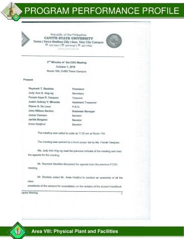 PROGRAM PERFORMANCE PROFILE Area VIII: Physical Plant and Facilities