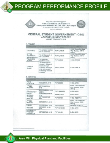 PROGRAM PERFORMANCE PROFILE Area VIII: Physical Plant and Facilities