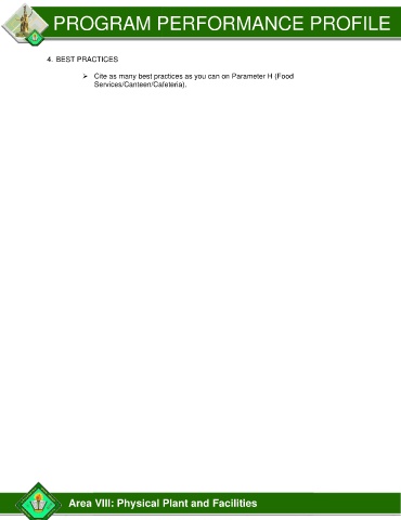 PROGRAM PERFORMANCE PROFILE 4. BEST PRACTICES ➢ Cite as many best practices as you can on Parameter H (Food Services/Canteen/Cafeteria). Area VIII: Physical Plant and Facilities
