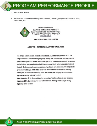PROGRAM PERFORMANCE PROFILE 2. IMPLEMENTATION ➢ Describe the site where the Program is situated, including geographical location, area, boundaries, etc. Area VIII: Physical Plant and Facilities