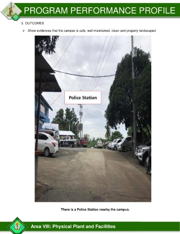 PROGRAM PERFORMANCE PROFILE 3. OUTCOMES ➢ Show evidences that the campus is safe, well-maintained, clean and properly landscaped. There is a Police Station nearby the campus. Area VIII: Physical Plant and Facilities