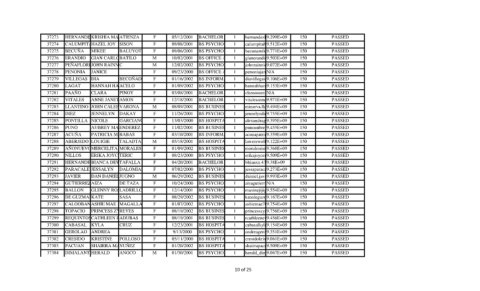 37290 NILLOS ERIKA JOYCETERIC F 08/23/2000 BS PSYCHOLOGY erikajoycenillos@yahoo.com150 PASSED