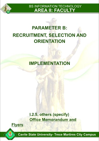 BS INFORMATION TECHNOLOGY AREA II: FACULTY PARAMETER B: RECRUITMENT, SELECTION AND ORIENTATION IMPLEMENTATION I.2.5. others (specify) Office Memorandum and Flyers Cavite State University- Trece Martires City Campus