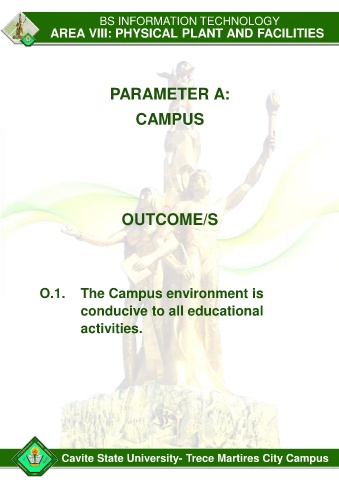 BS INFORMATION TECHNOLOGY AREA VIII: PHYSICAL PLANT AND FACILITIES PARAMETER A: CAMPUS OUTCOME/S O.1. The Campus environment is conducive to all educational activities. Cavite State University- Trece Martires City Campus