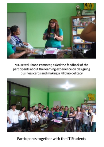 Ms. Kristel Shane Paminter, asked the feedback of the participants about the learning experience on designing business cards and making a Filipino delicacy Participants together with the IT Students