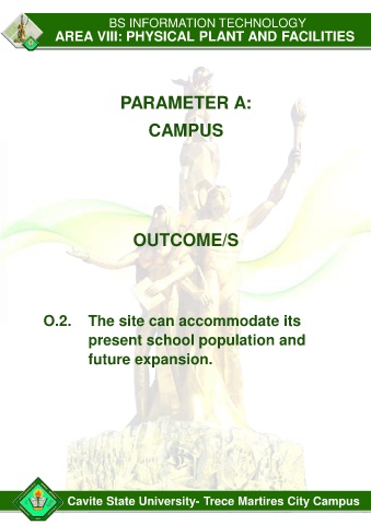 BS INFORMATION TECHNOLOGY AREA VIII: PHYSICAL PLANT AND FACILITIES PARAMETER A: CAMPUS OUTCOME/S O.2. The site can accommodate its present school population and future expansion. Cavite State University- Trece Martires City Campus