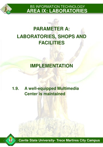 BS INFORMATION TECHNOLOGY AREA IX: LABORATORIES PARAMETER A: LABORATORIES, SHOPS AND FACILITIES IMPLEMENTATION 1.9. A well-equipped Multimedia Center is maintained Cavite State University- Trece Martires City Campus