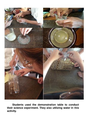 Students used the demonstration table to conduct their science experiment. They also utilizing water in this activity.