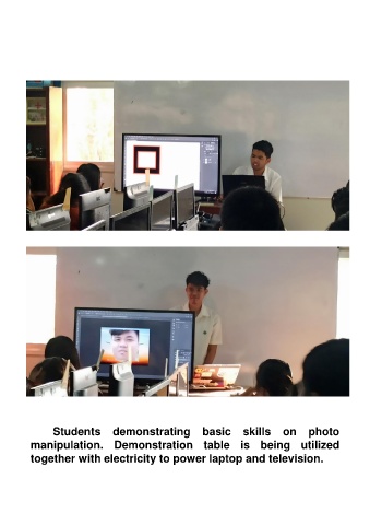 Students demonstrating basic skills on photo manipulation. Demonstration table is being utilized together with electricity to power laptop and television.