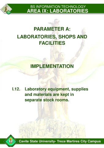 BS INFORMATION TECHNOLOGY AREA IX: LABORATORIES PARAMETER A: LABORATORIES, SHOPS AND FACILITIES IMPLEMENTATION I.12. Laboratory equipment, supplies and materials are kept in separate stock rooms. Cavite State University- Trece Martires City Campus