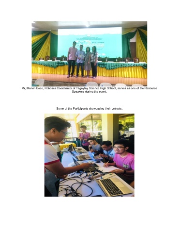 Mr, Mervin Boco, Robotics Coordinator of Tagaytay Science High School, serves as one of the Resource Speakers during the event. Some of the Participants showcasing their projects.