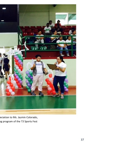 Awarding the Certificate of Appreciation to Ms. Jazmin Colorado, the guest speaker during opening program of the T3 Sports Fest 37