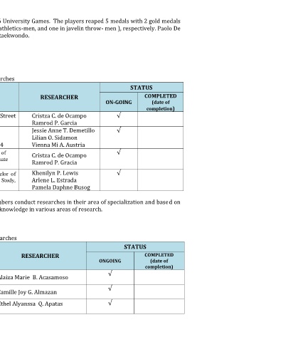 Table 19. List of on-going and completed student researches