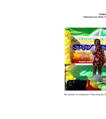 Students’ Day 2016 February 16, 2016, CvSU –Trece Campus Ground The masters of ceremonies of the program, Ms. Desiree Anne O. Dedase and Mr. Arvin O. Flores